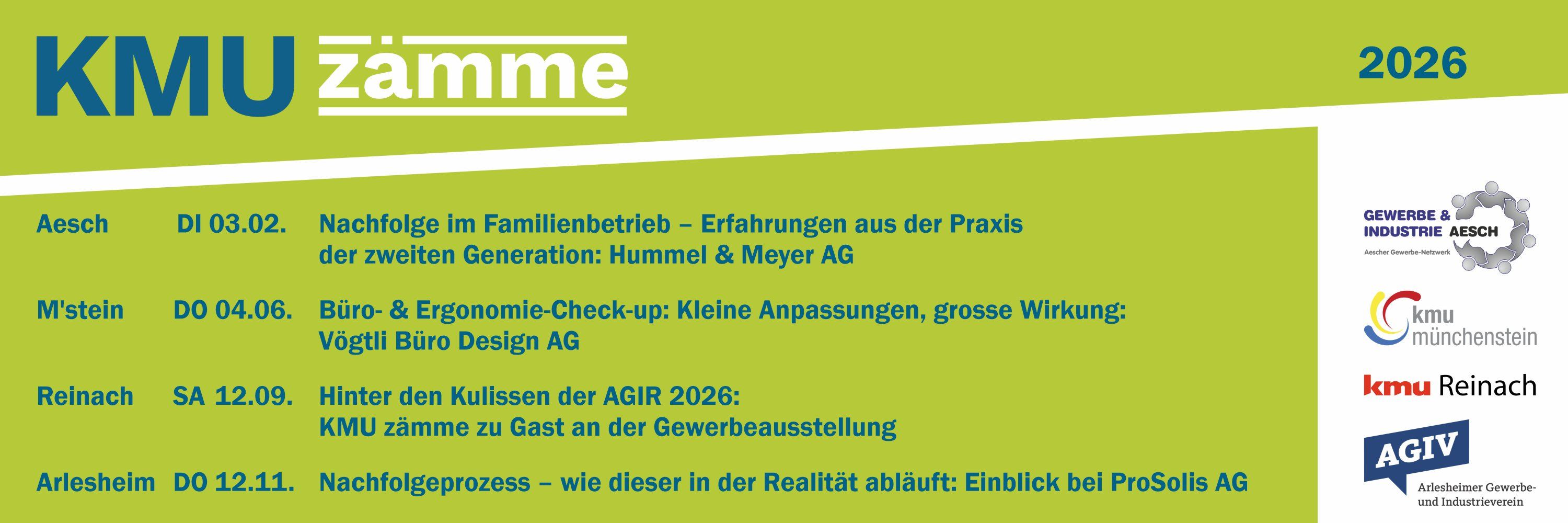 KMU zämme ist das gemeinsame Format der vier KMU-Vereine Aesch, Arlesheim, Münchenstein und Reinach,