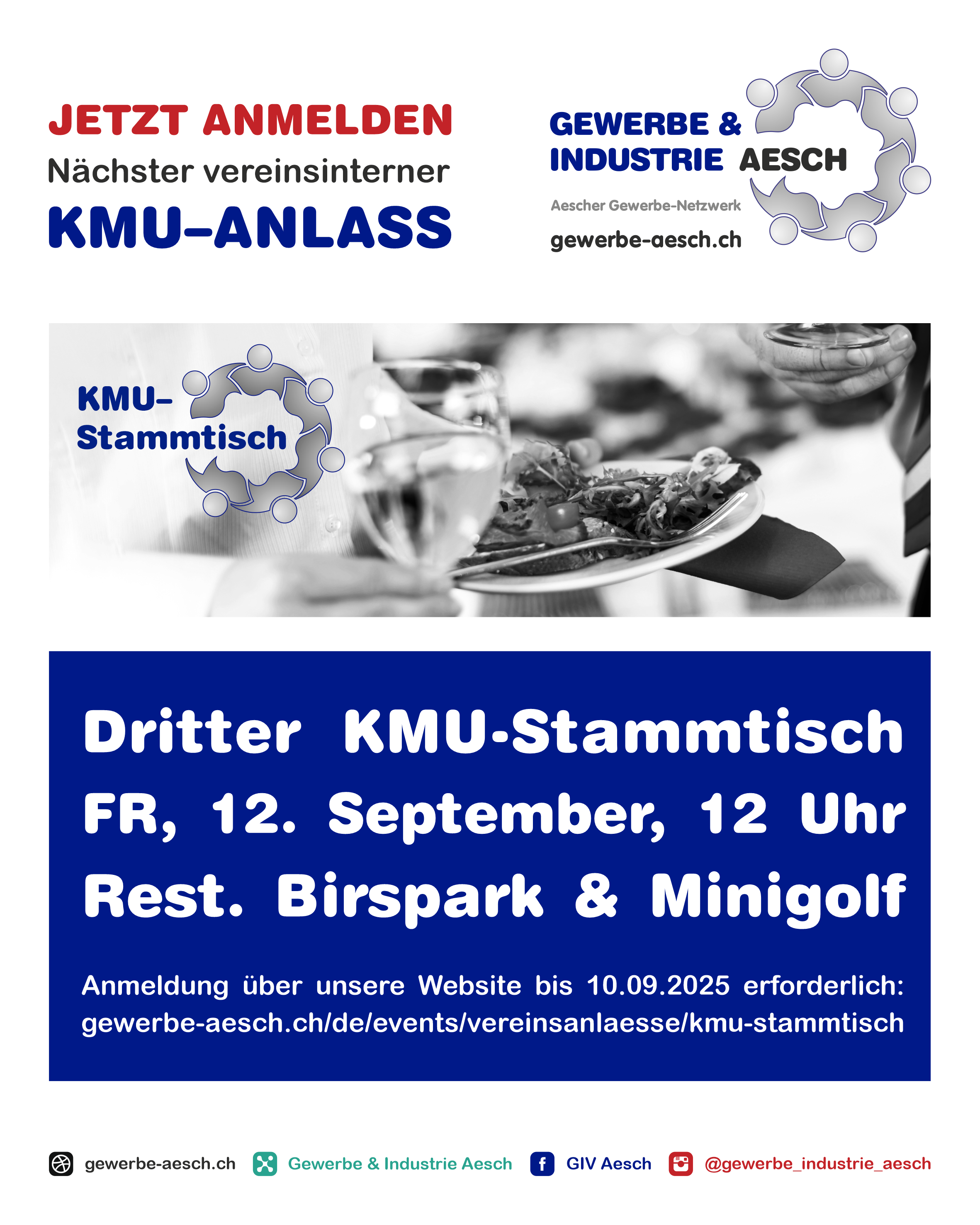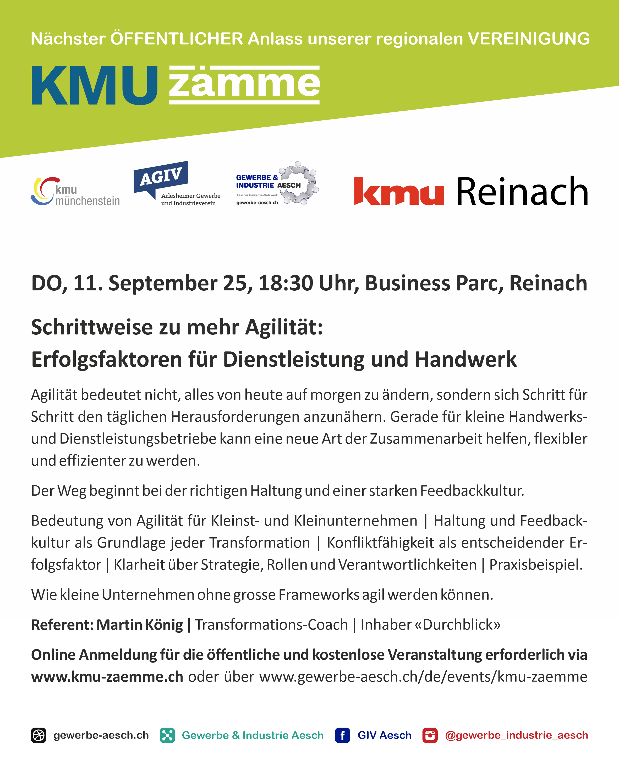 - DO 11. September 18:30 KMU zämme Reinach Business Parc, Reinach