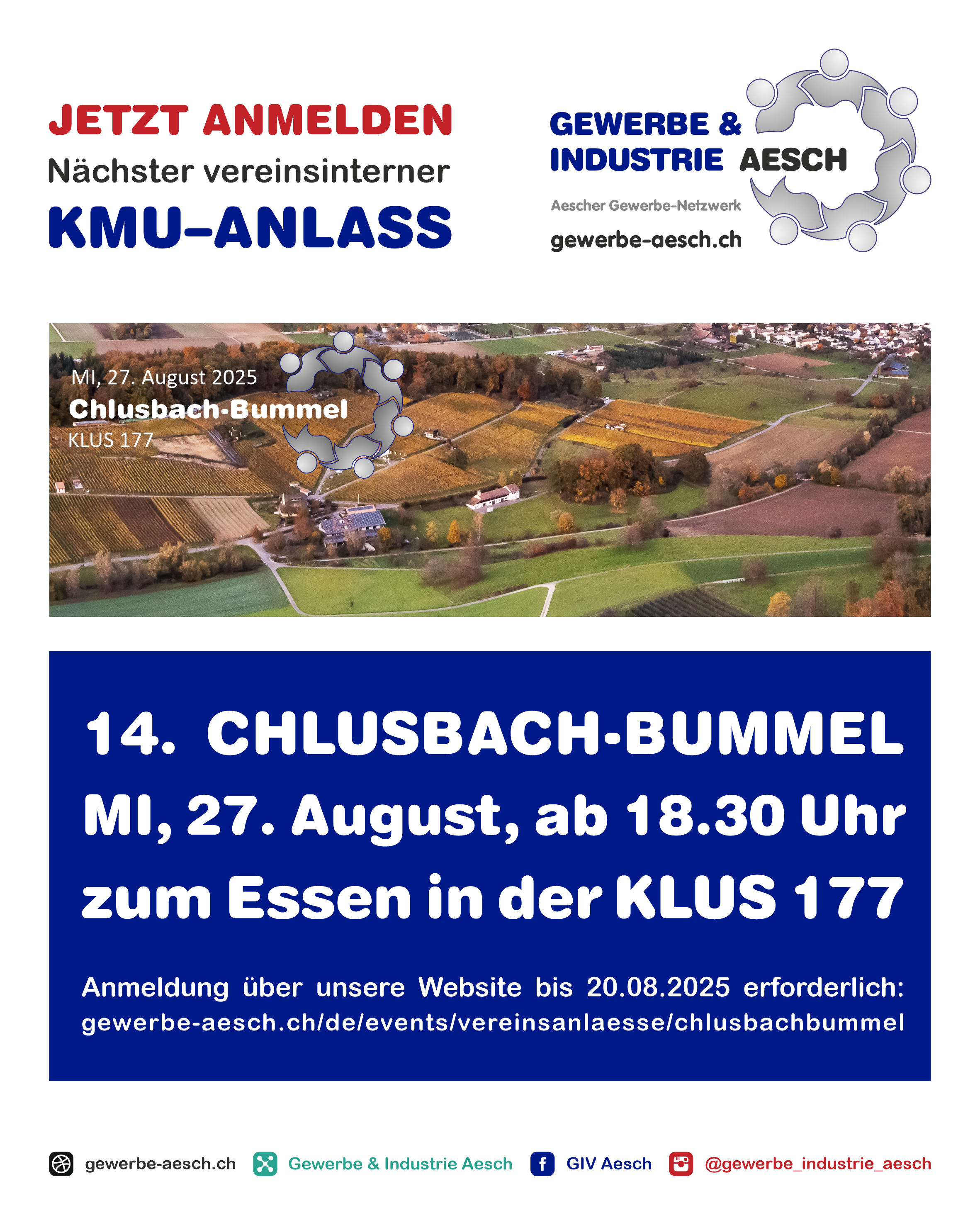 - DO 28. Mai 18 Uhr Infoveranstaltung AGIR26 (Teilnahme auch für Aescher KMUs im Sept. 26 möglich), Gemeindehaus Reinach mit Anmeldung