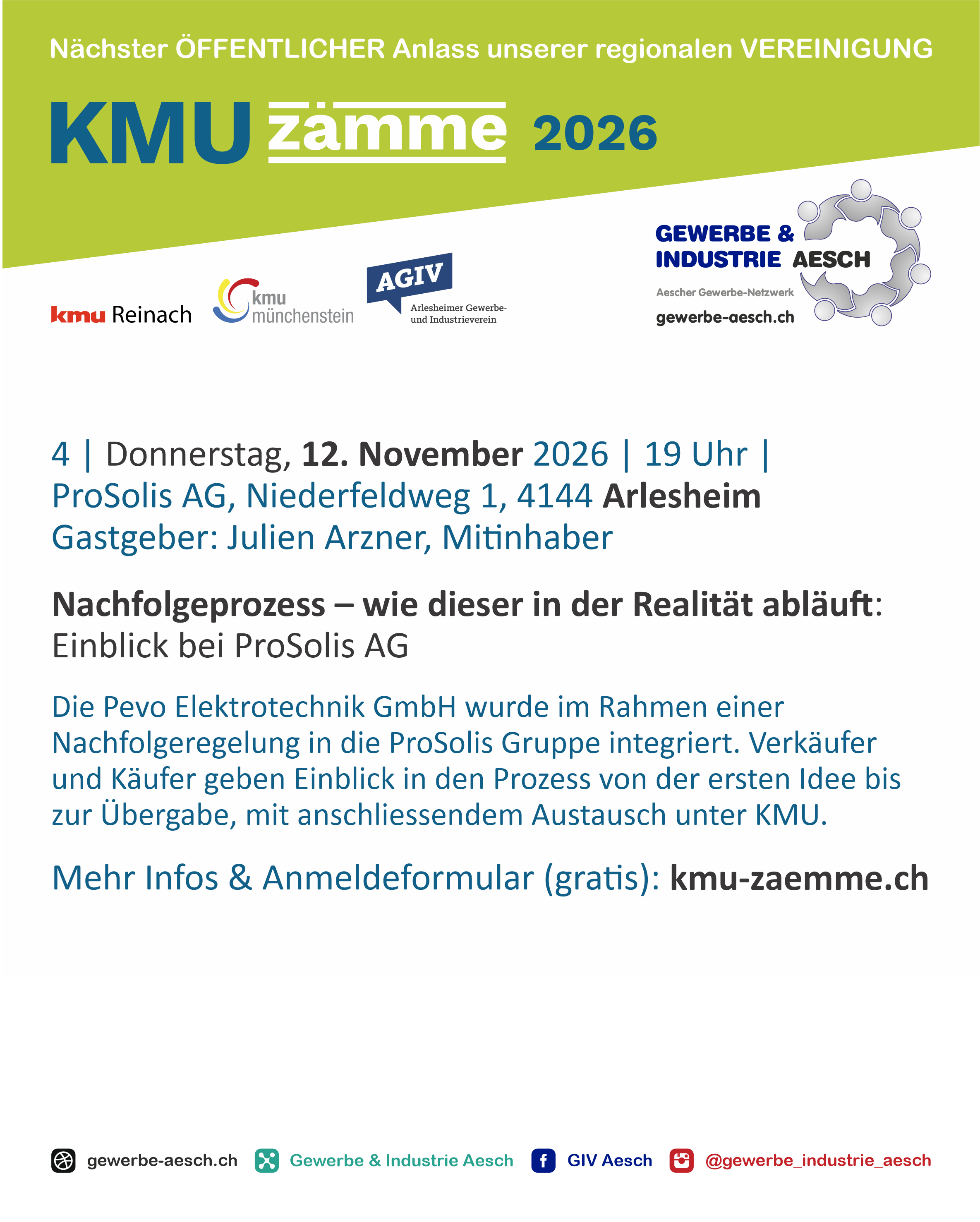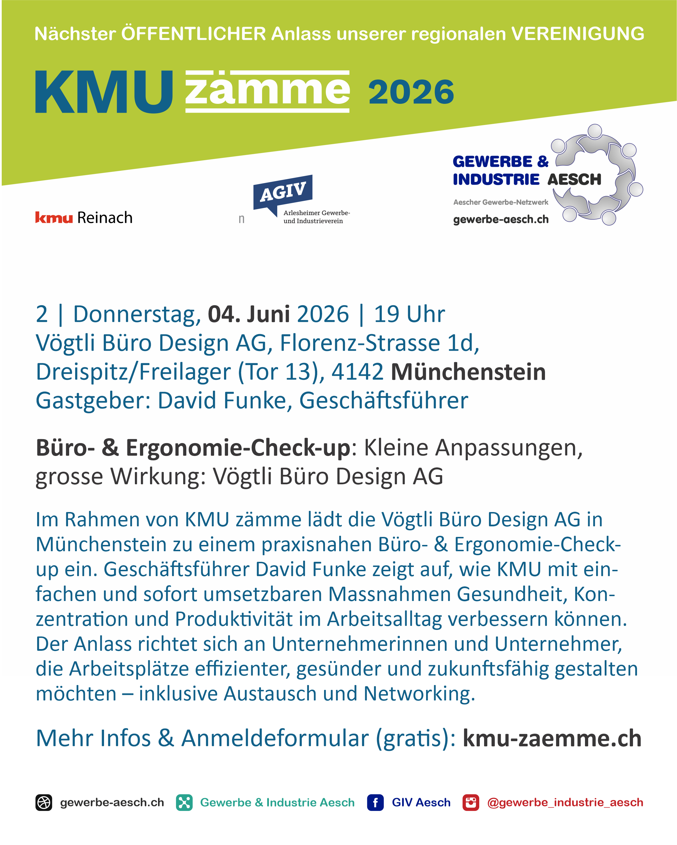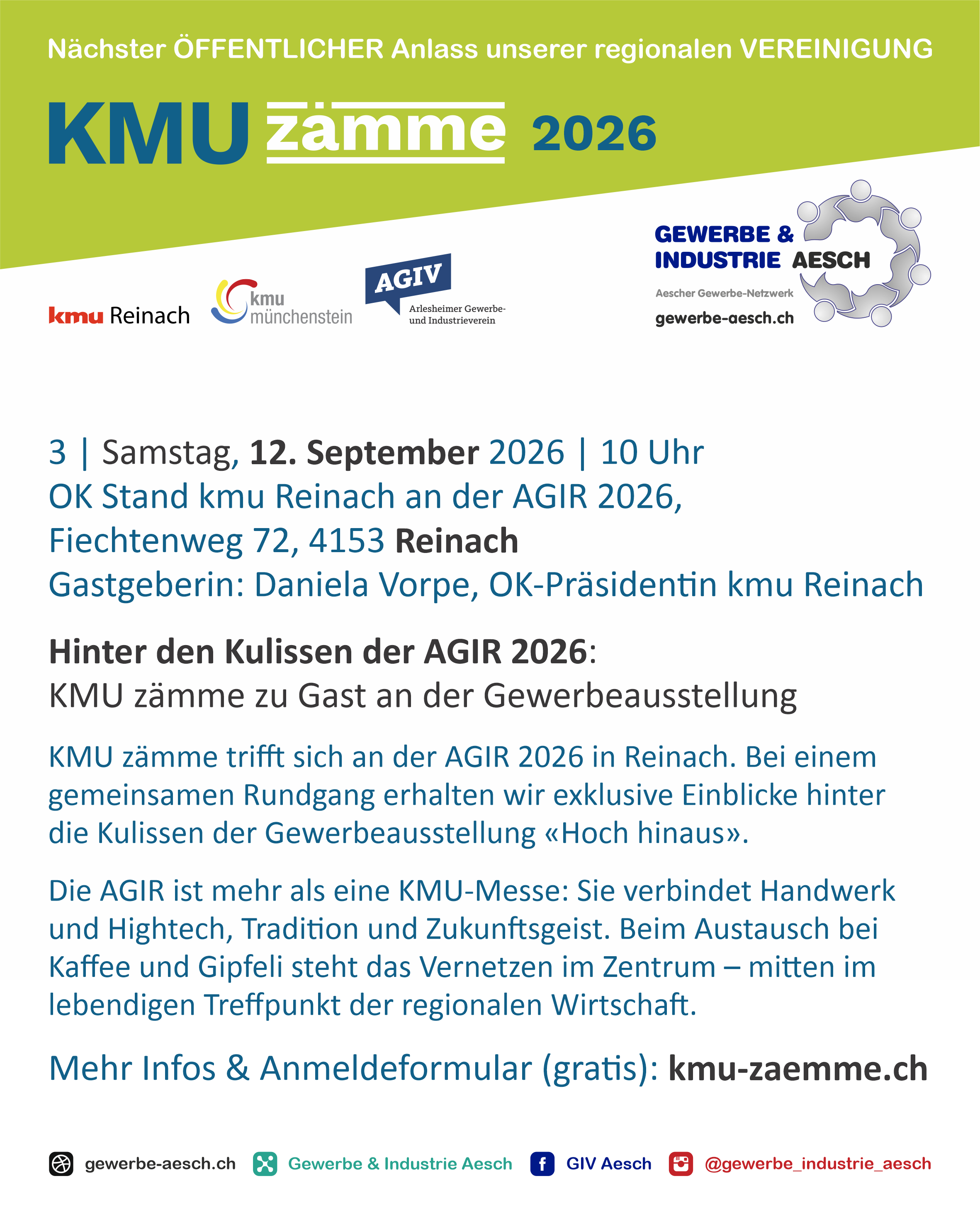 KMU zämme ist das gemeinsame Format der vier KMU-Vereine Aesch, Arlesheim, Münchenstein und Reinach,