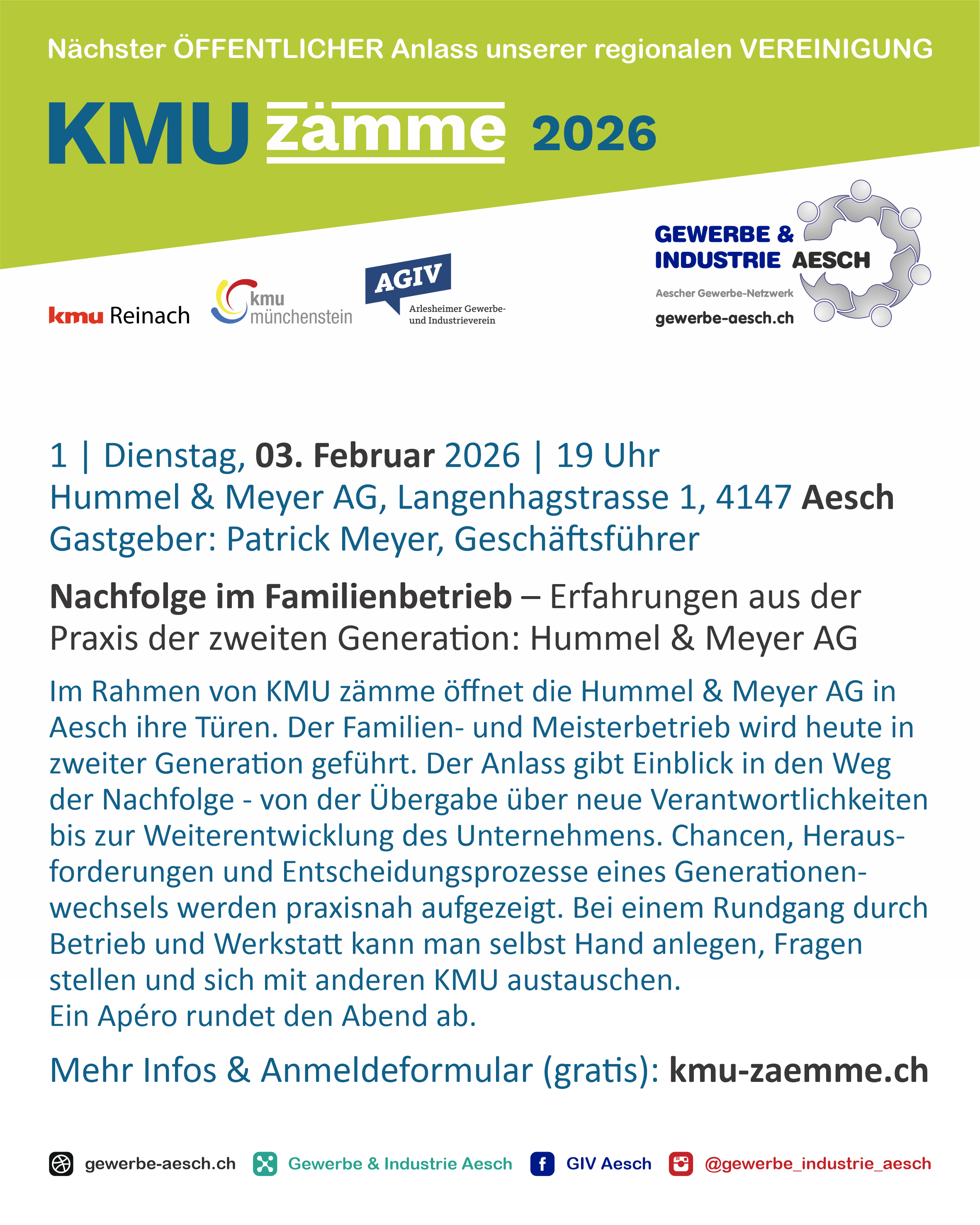 Im Rahmen von KMU zämme öffnet die Hummel & Meyer AG in Aesch ihre Türen. Der Familien- und Meisterbetrieb wird heute in zweiter Generation geführt. Der Anlass gibt Einblick in den Weg der Nachfolge - von der Übergabe über neue Verantwortlichkeiten bis zur Weiterentwicklung des Unternehmens. Chancen, Herausforderungen und Entscheidungsprozesse eines Generationenwechsels werden praxisnah aufgezeigt.
