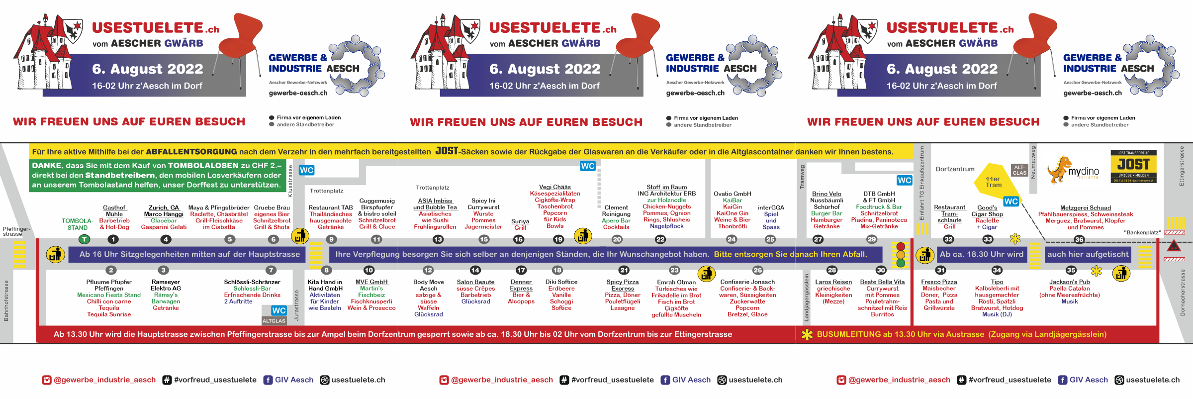am 06.08.2022 | Abgabe/Verkauf der Tombolalose an Kunden/Gäste sowie an der USESTUELETE Aufbau der Stände ab 14 Uhr möglich FESTBETRIEB ab 16 Uhr bis 02 Uhr |